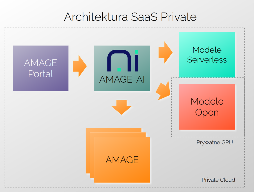 Model PaaS (chmura prywatna lub dedykowana) jest przeznaczony dla organizacji, które oczekują większej kontroli nad środowiskiem niż w SaaS, a jednocześnie chcą zachować zalety chmury: skalowalność, automatyzację utrzymania oraz możliwość szybkiej rozbudowy. AMAGE AI działa na dedykowanej infrastrukturze chmurowej zaprojektowanej pod wymagania klienta (architektura, sieć, izolacja, polityki dostępu, integracje).