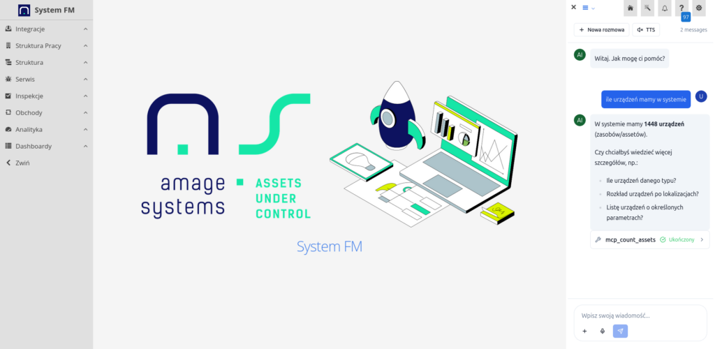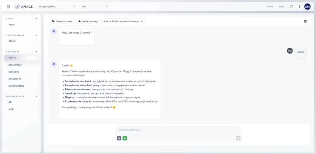 - dostęp do danych procesowych AMAGE (np. zasoby, zgłoszenia, zlecenia, harmonogramy, inspekcje) jako kontekstu rozmowy i pracy agentów,