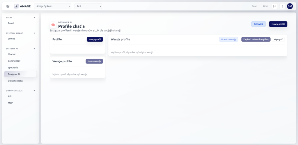 W AMAGE AI dostępny jest projektant promptów, profili konwersacji i agentów, który pozwala w uporządkowany sposób definiować zachowanie asystentów: ich rolę, zakres kompetencji, źródła kontekstu, sposób odpowiadania oraz zasady bezpieczeństwa. Dzięki temu mechanizmy konwersacyjne można konfigurować i testować przed udostępnieniem użytkownikom – bez „ręcznego” utrzymywania wielu wariantów promptów i bez ryzyka niespójnych ustawień pomiędzy środowiskami.