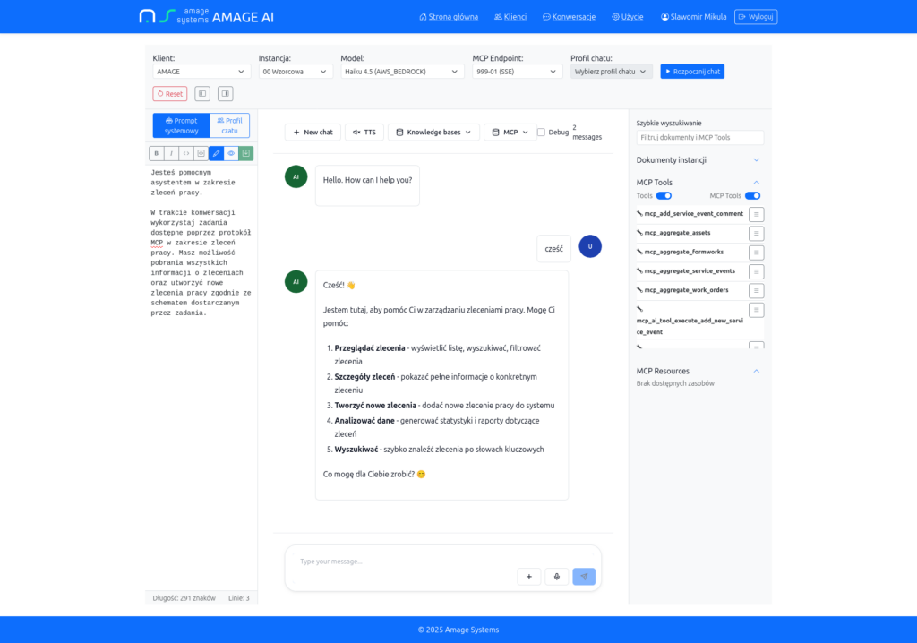 - integracje z instancjami AMAGE i usługami zewnętrznymi poprzez serwery MCP i konektory,